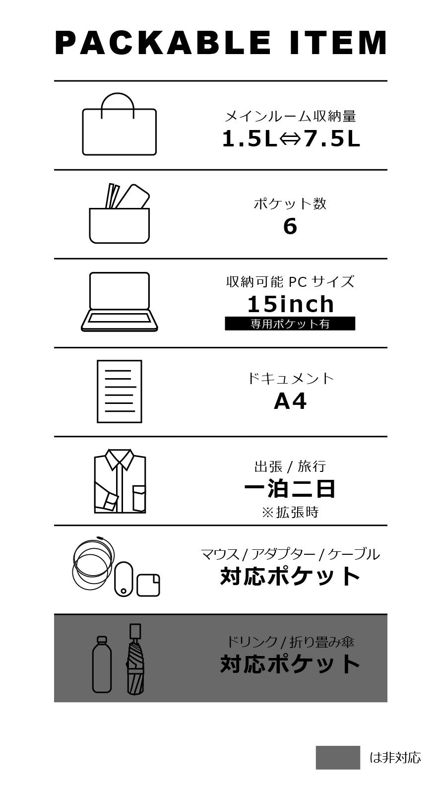 薄型設計の本体はノートPCなどを収納、大きいマチ付きのフロントポケットには、デジタルデバイスや財布やスマホが収納可能。収納物が多くなればマチのファスナーを開けることで、マチが拡張するエキスパンダブル仕様となっている。