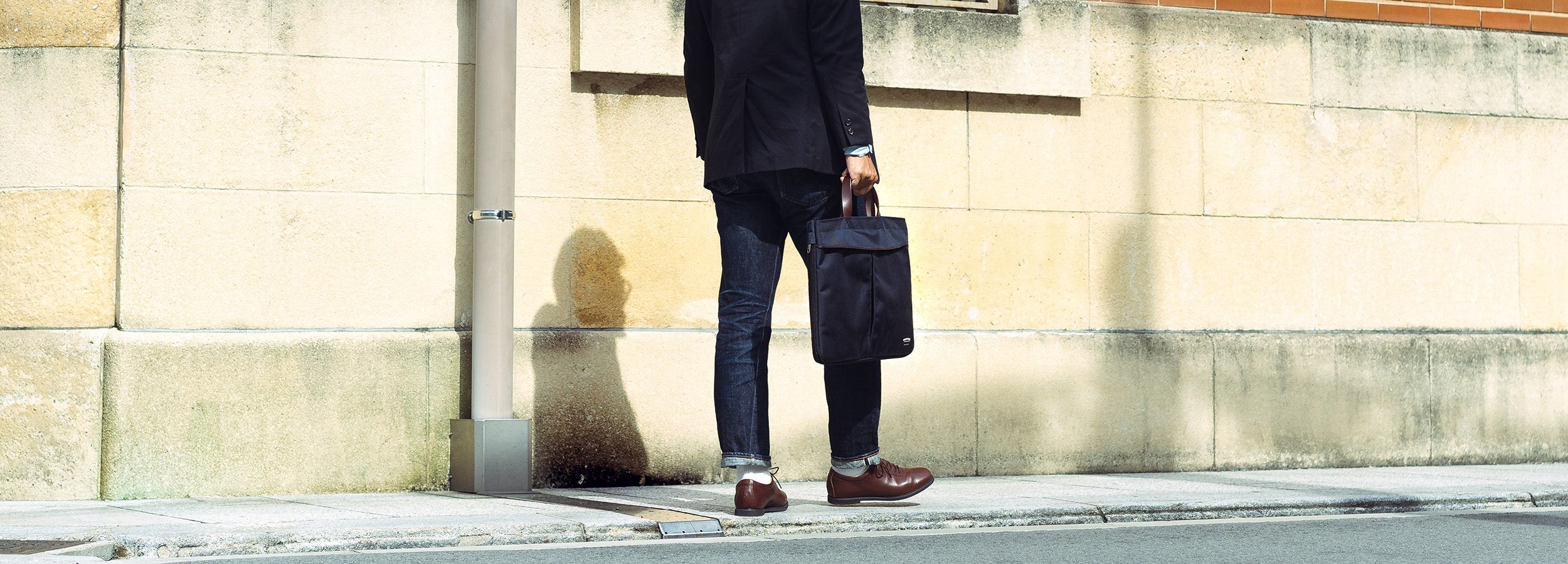 ヘルメットバッグをベースとした超薄型のブリーフケース。カジュアルになりすぎない、ジャケットスタイルに最適なデザインを目指した。