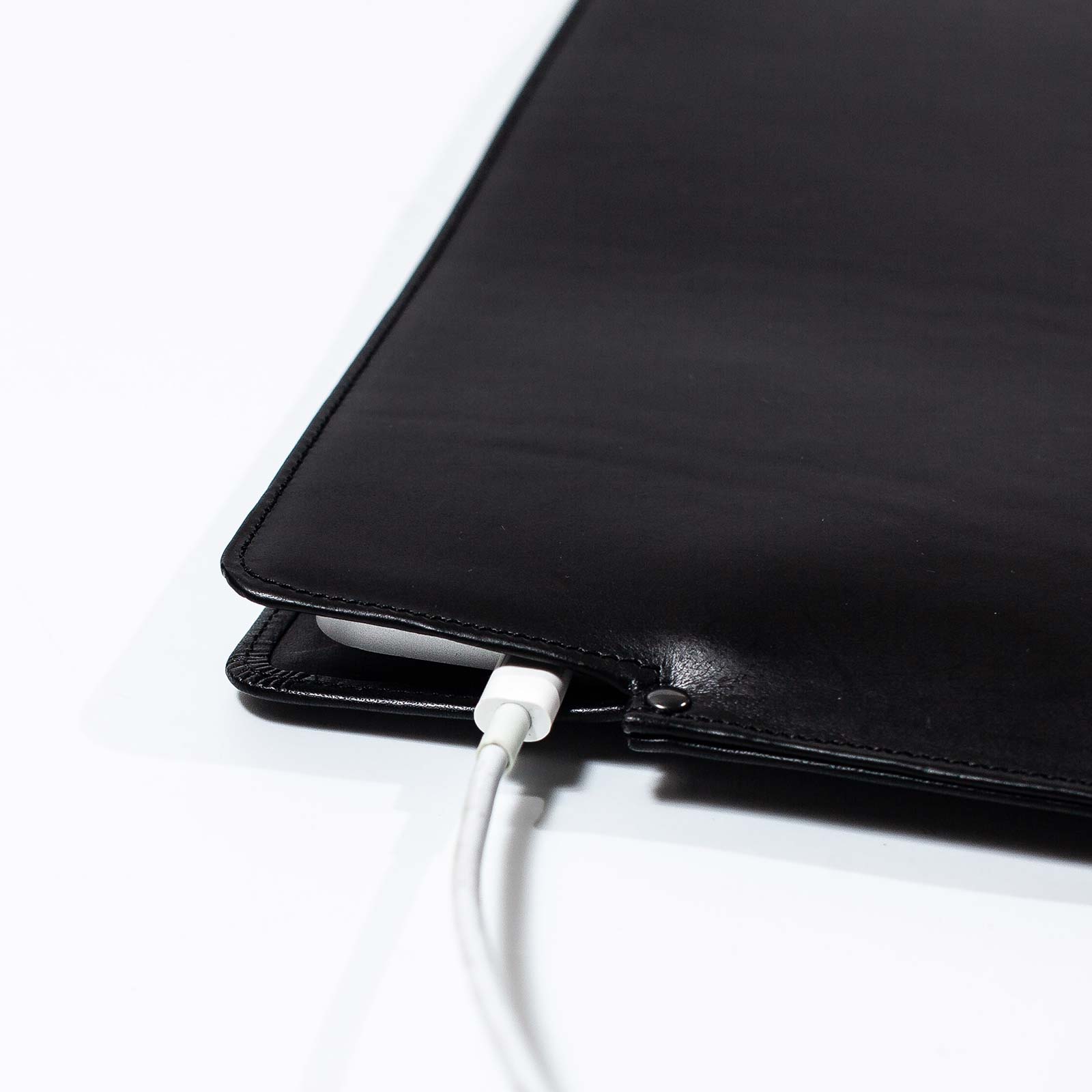 片側の段差は上まで縫製せず、スリットになっているため、PCを収納したまま充電に接続が可能。