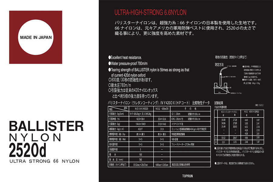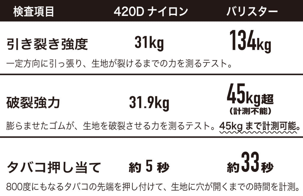 バリスターナイロンは、日本の生地メーカーが作っており、公的機関において、さまざまな比較テストが行われている。