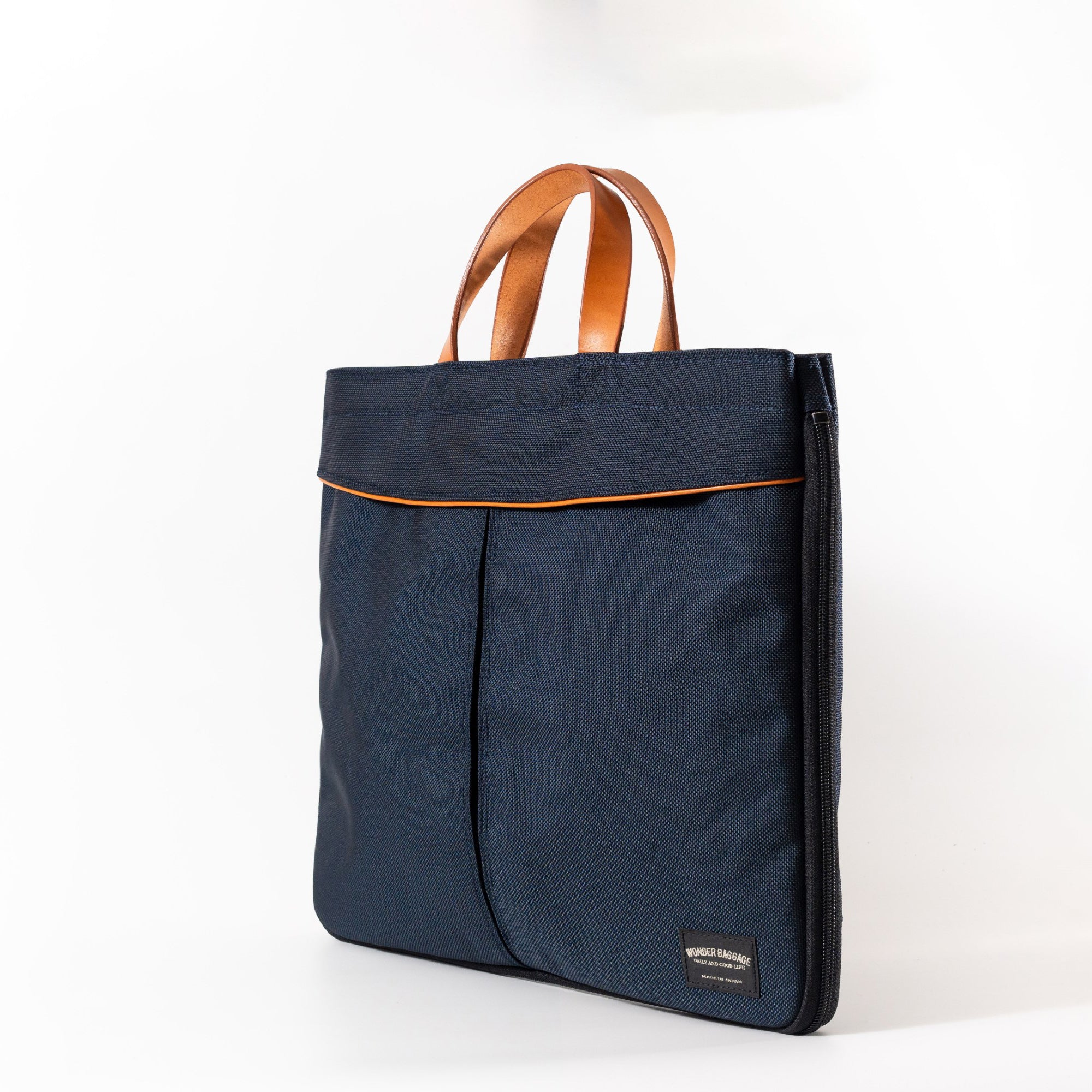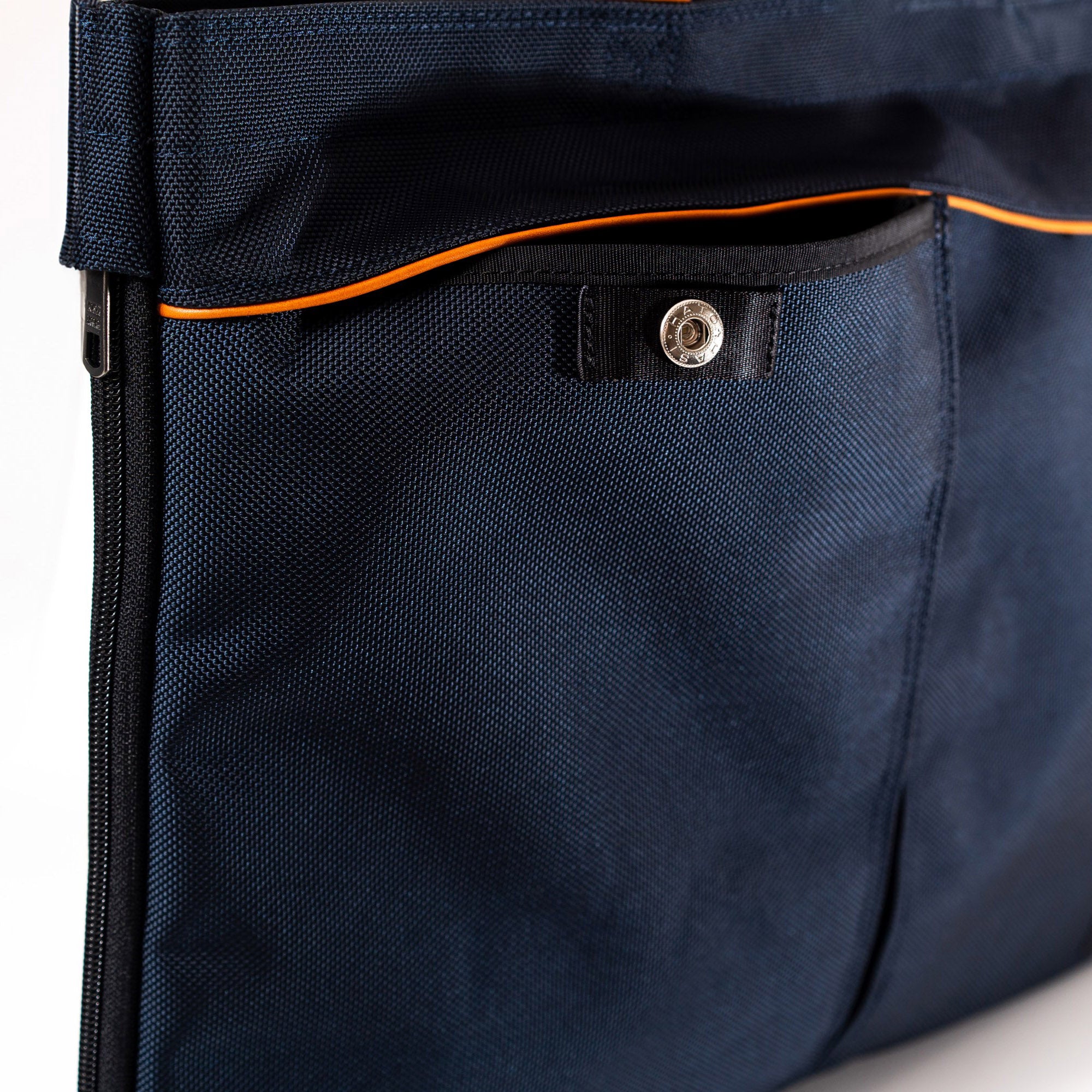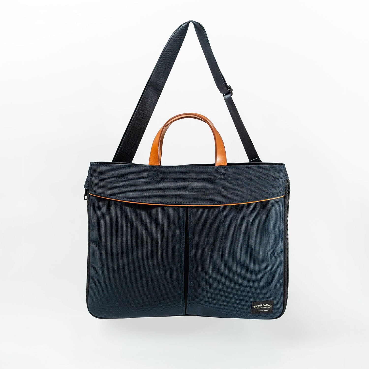 ヘルメットバッグをデザインモチーフにした超薄マチブリーフケース。現代のビジネススタイルに合わせ、PCデバイス類の収納をメインとして設計。メインコンパートメントにはPCやタブレット本体を納め、そこにバッテリーや付属品を納めるポケットが配置されている。本体前胴にはマチ付き大型ポケットが二室。メインコンパートメントに匹敵する収納力を持つ。