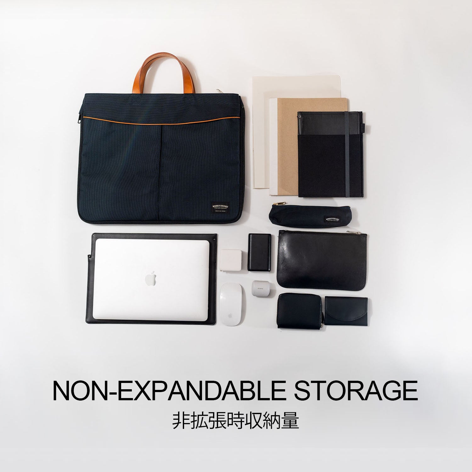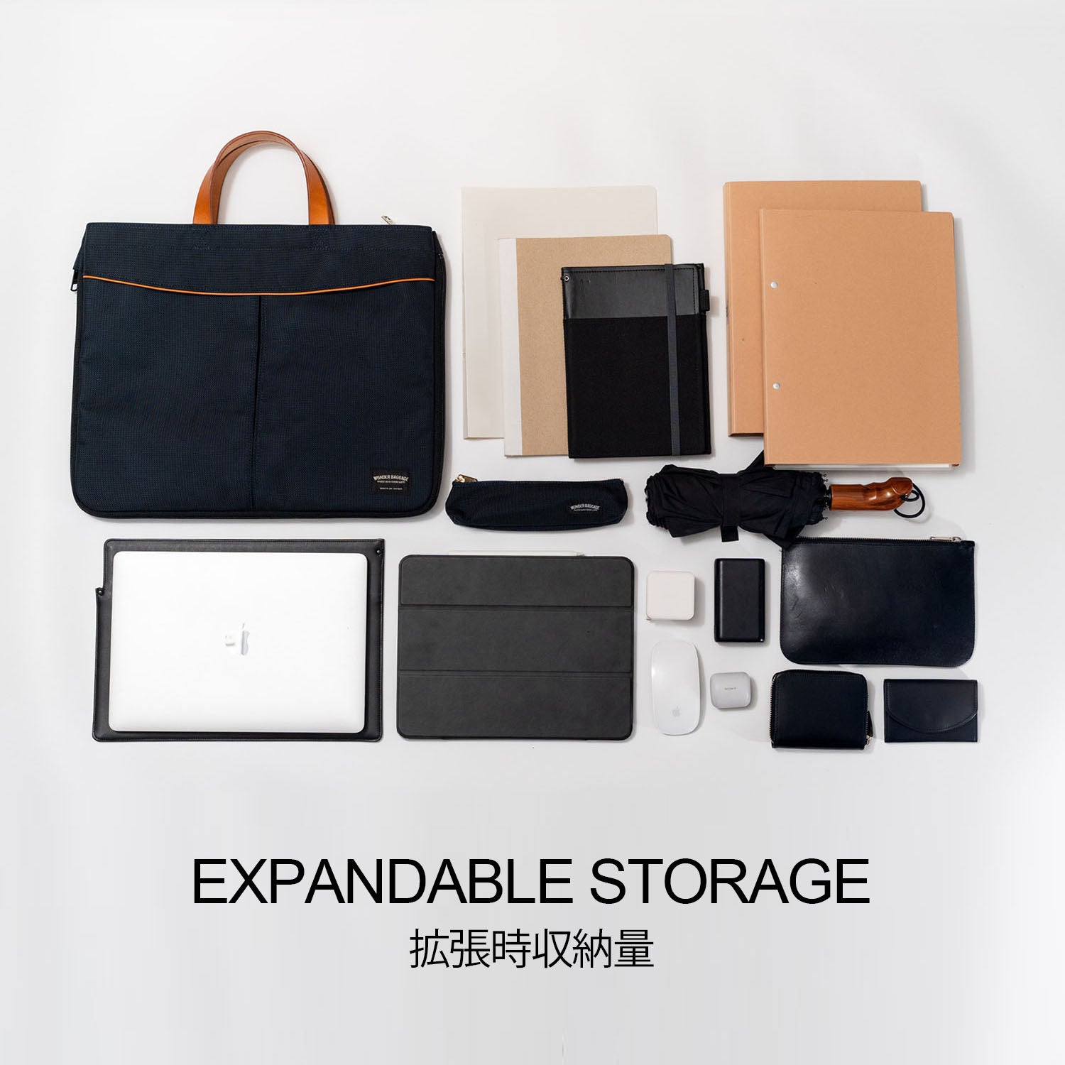 最大の特徴はエキスパンダブル(拡張)機能を搭載していること。最薄のデメリットである収納量をカバー、マチのファスナーを開けると100mmのマチが出現する。