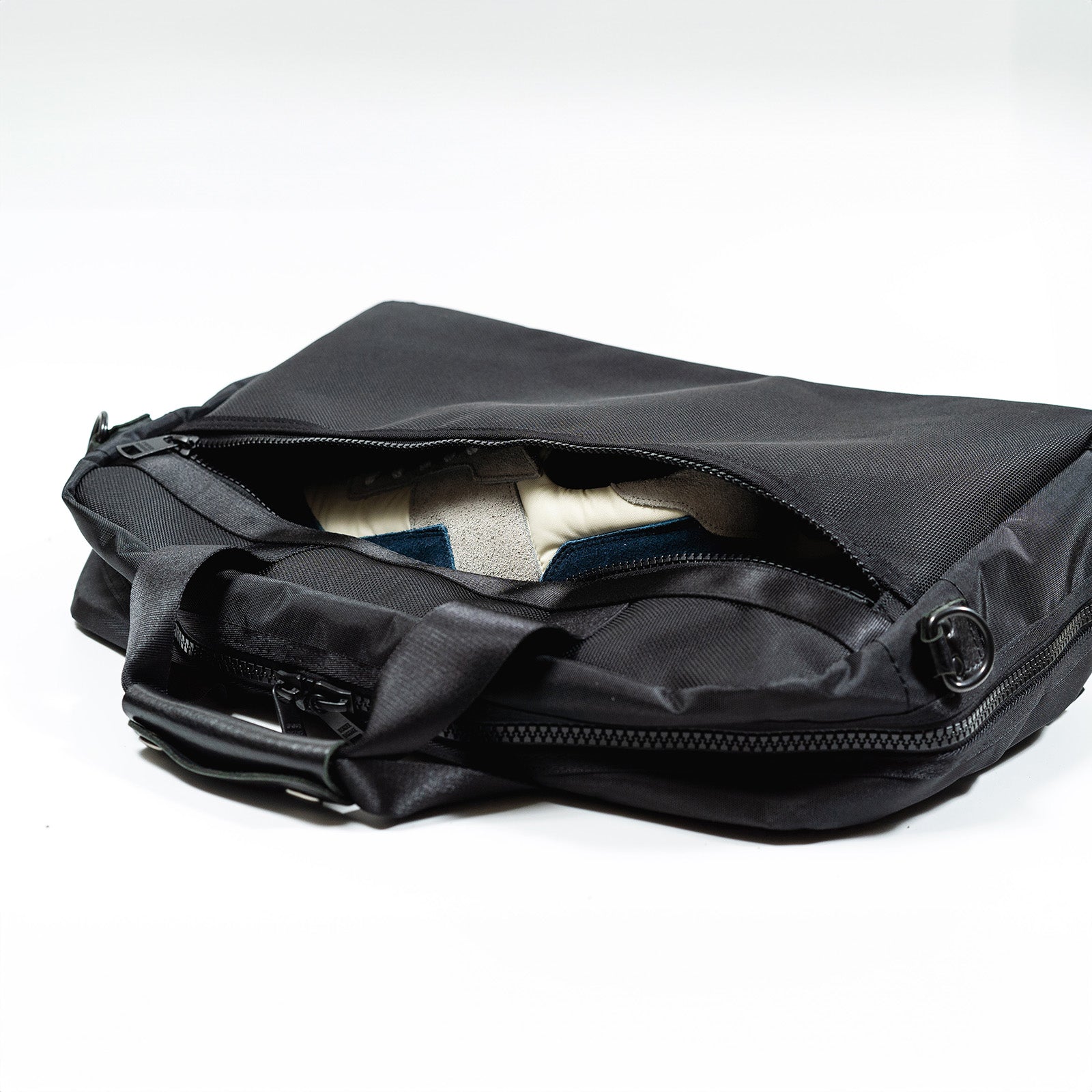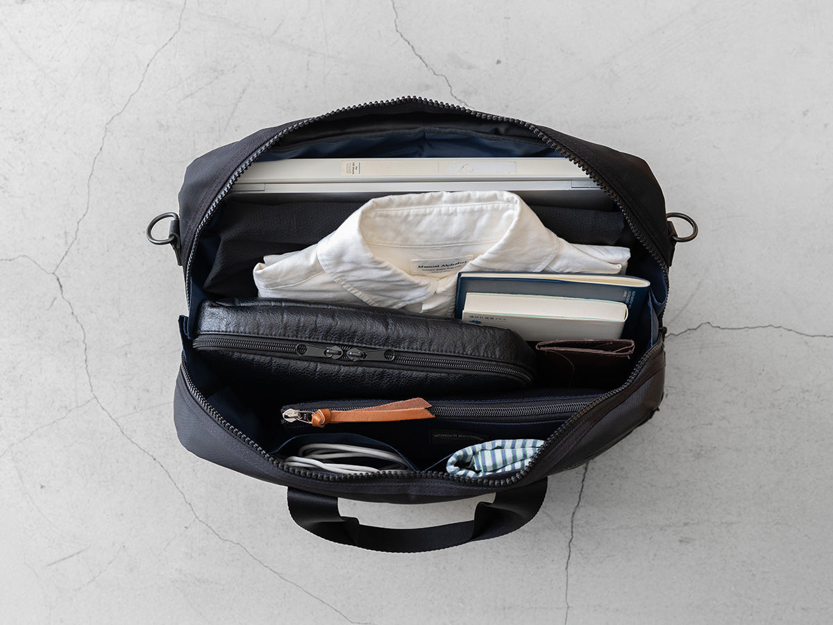 内装はシンプルなオープンポケット2室。前胴には財布やスマホを収納できるサイズのファスナーポケット2室、後胴には靴が入る大きなサブポケットが一室配置。正面はA4ブリーフのサイズ感だが、マチを大きくとっているので通常のビジネスブリーフよりも沢山の荷物を収納することが可能。