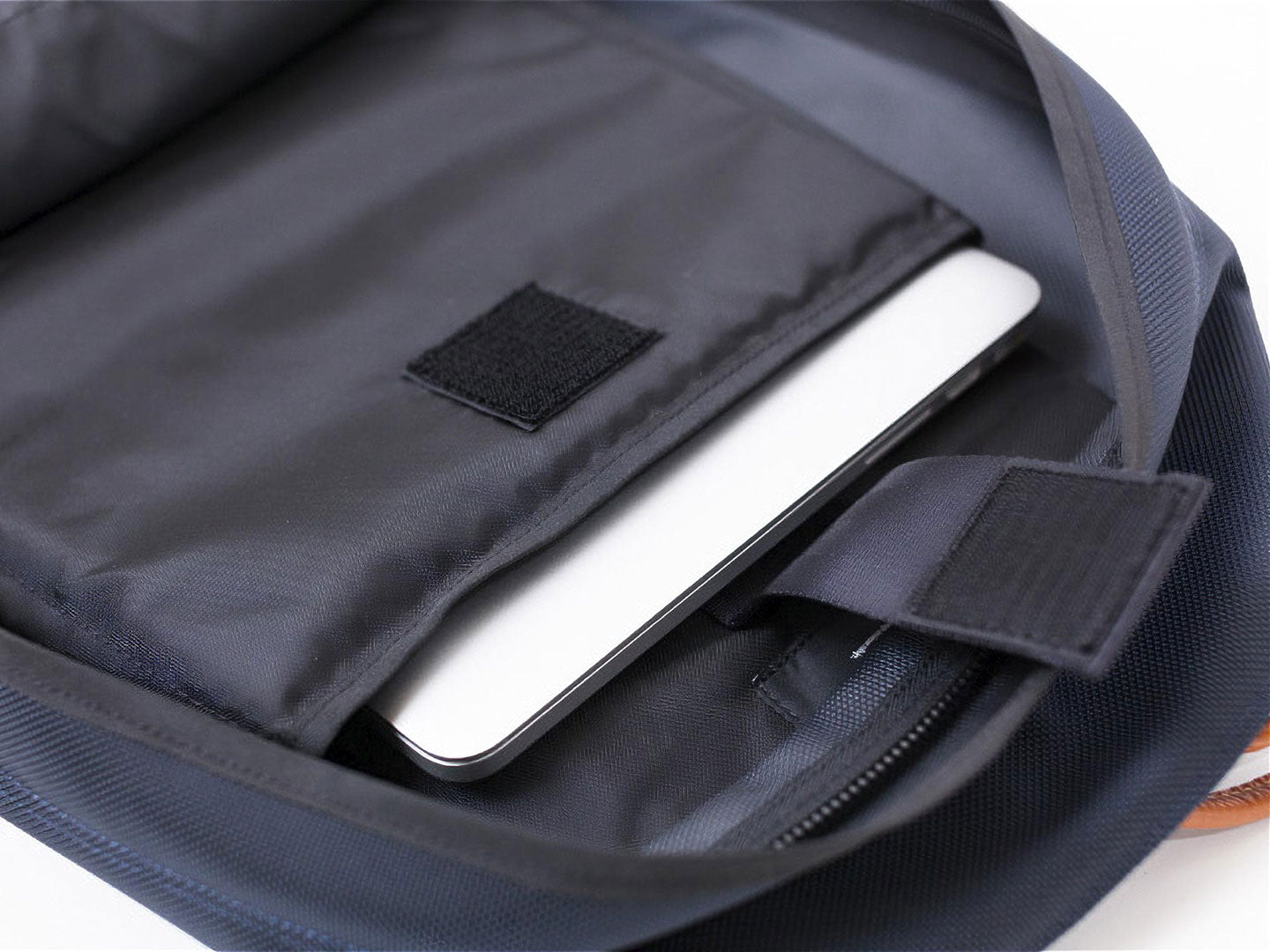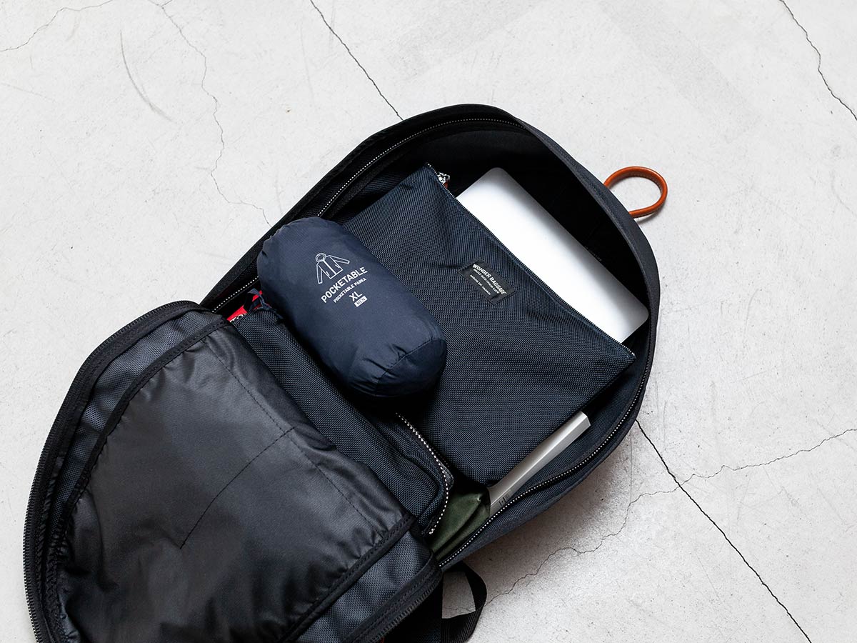 大きく開くメインコンパートメントにはデバイスポケットを。13inchまでのPCを余裕を持って収納できます。前胴にはフード付きのポケットを1つ配置。
