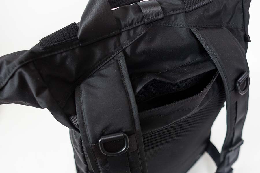 軽さと強度をポイントに、専門性と日用性が両立するアイテムとなっています。防水生地に加え、ロールトップ仕様、止水ジップポケットにより急な天候の変化にも対応可能です。