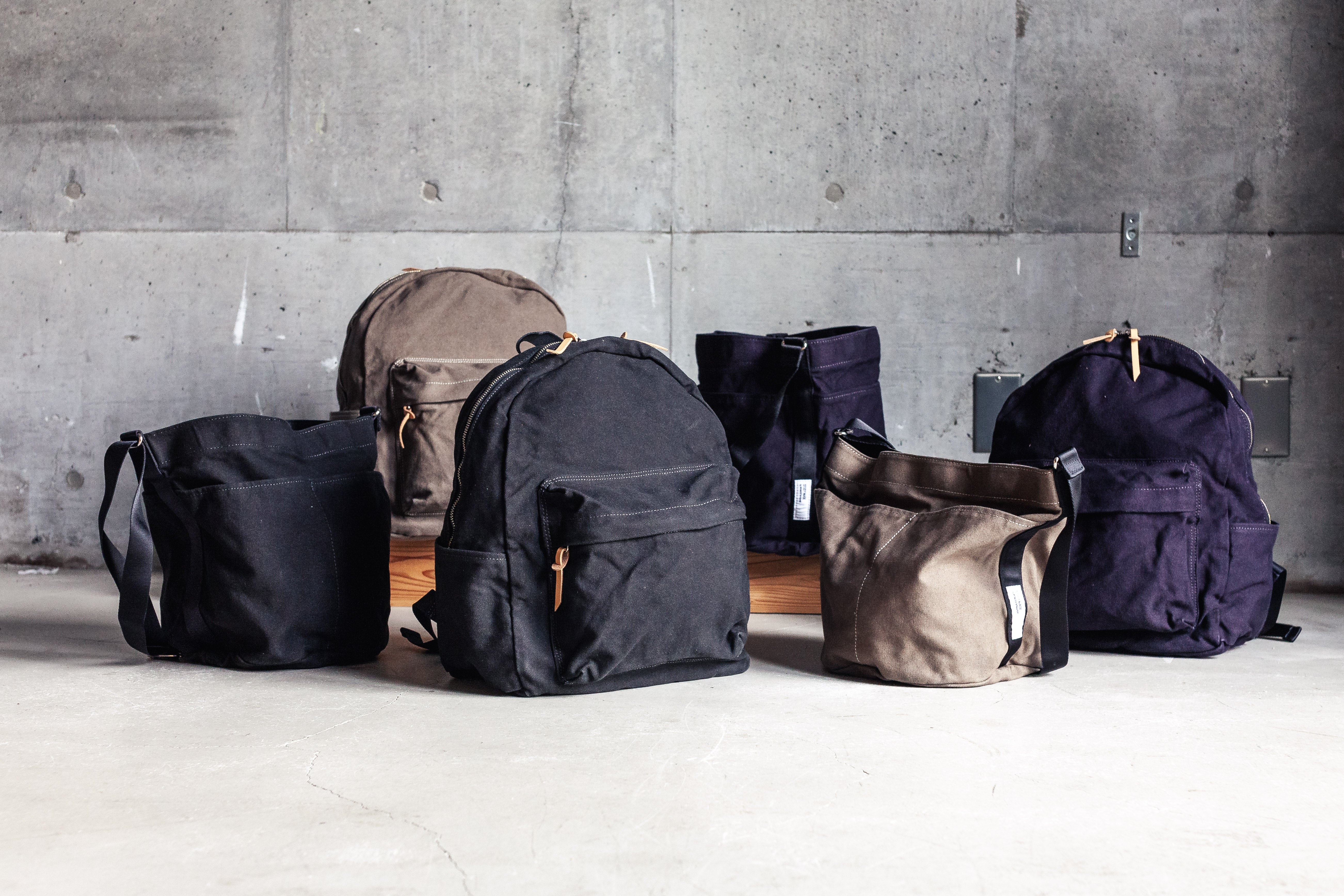 円筒状のショルダーバッグ。外周に4つのポケットを配置し、身の回り品を素早く収納ができる。本体材に8号帆布を使用、テープ材、フェルトのクッションなどディティールにこだわり抜いた設計となっている。