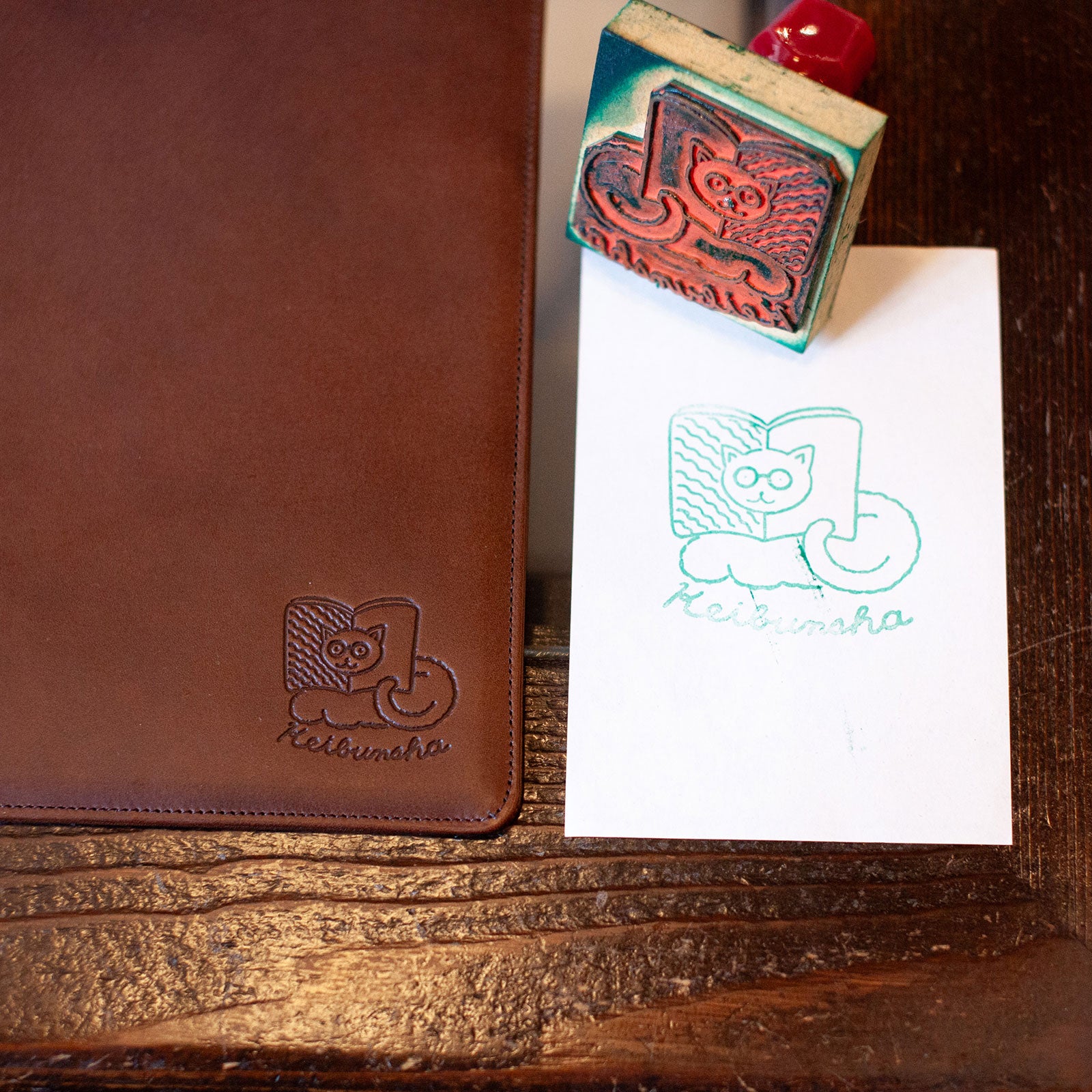 恵文社一押しの深いブラウンカラーのブッテーロレザーの表面には、店頭で長年愛されているキャラクター「めがねねこ」を刻印。
