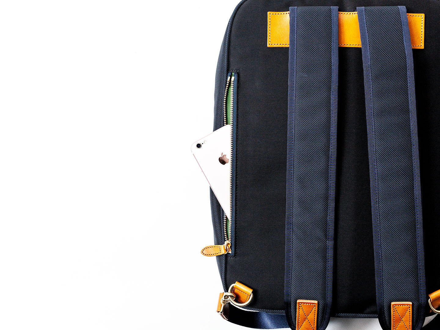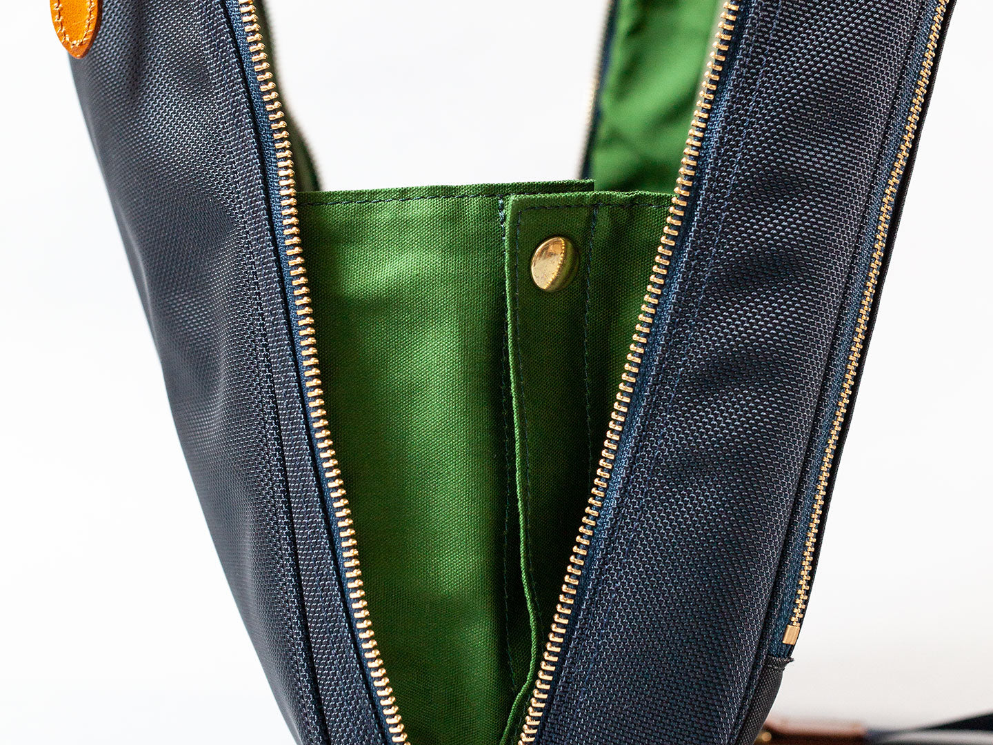 前面にはファスナーポケット。クイックに取り出したい小物やメモなどを収納可能。背面には隠しマチポケットを配置。財布やスマートフォン、鍵などの収納に便利です。