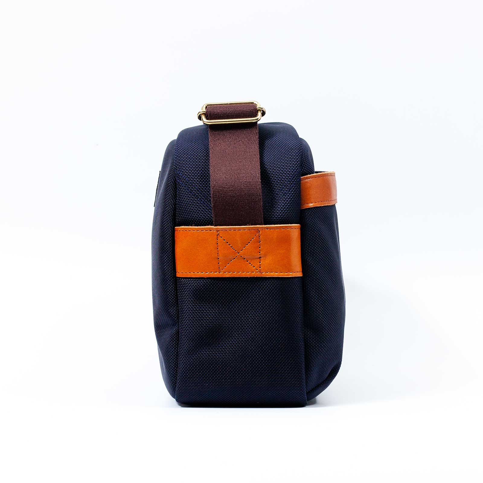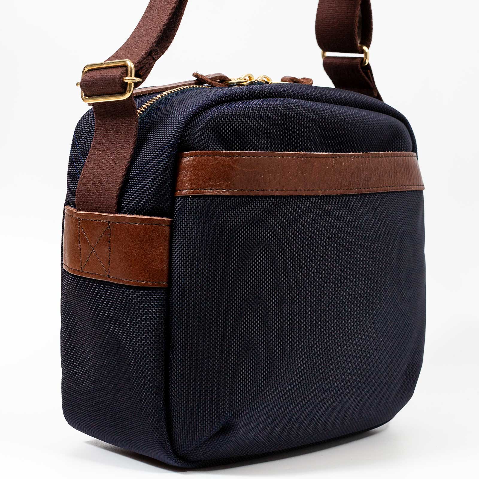 全面をバリスターナイロンで構成。四方を同率曲線で交差し、交差点をラウンドで落としたゆるやかなシルエットのショルダーバッグ。天口のメタルファスナーによる開閉やシンプルな外装、部分使いされた厚口のオイルレザーがカメラバッグにはない佇まいを生み出している。