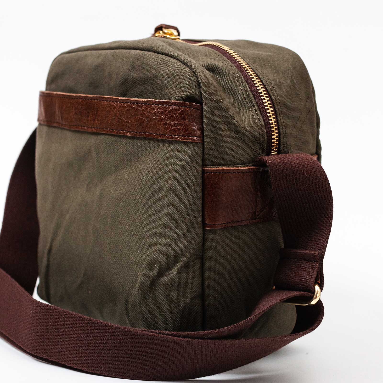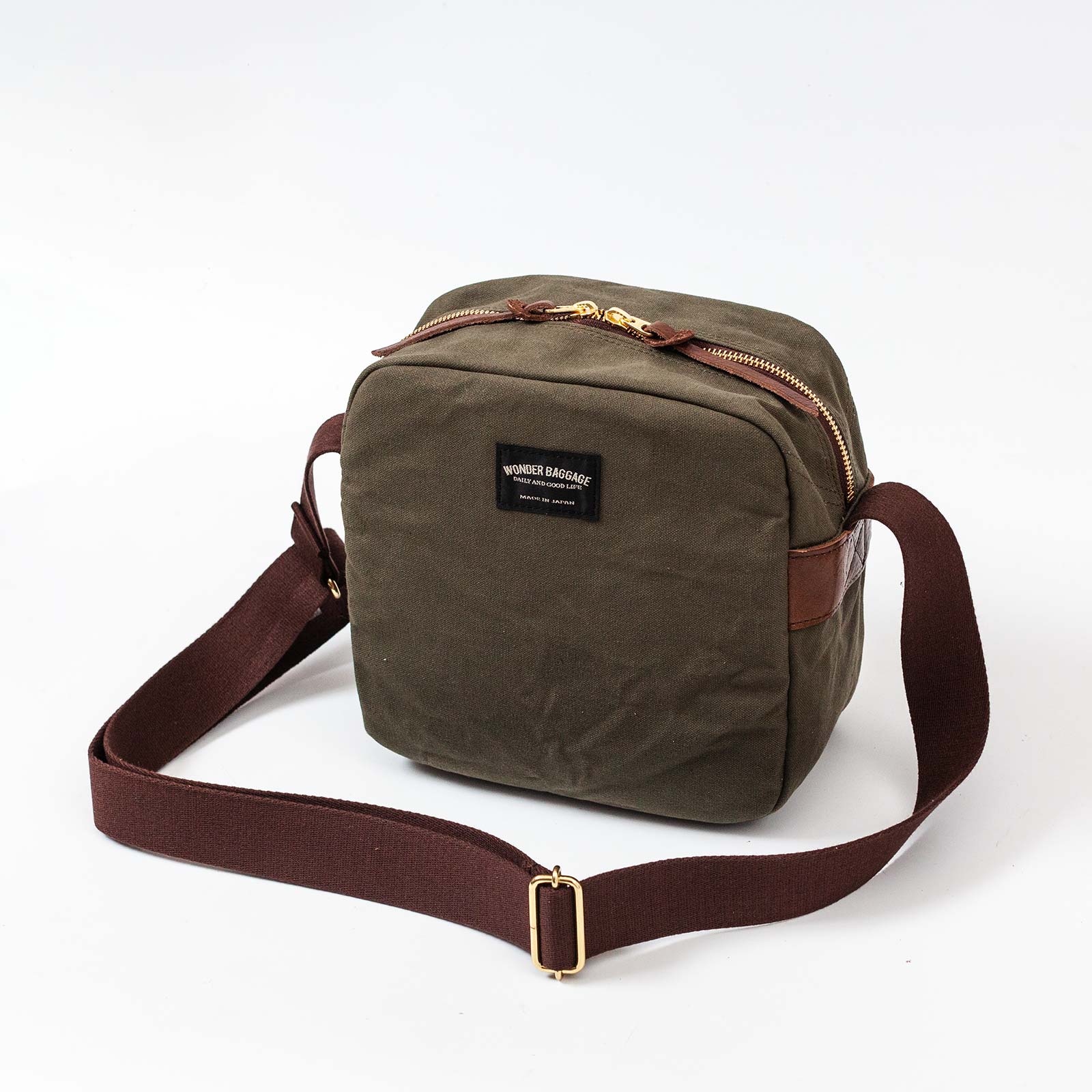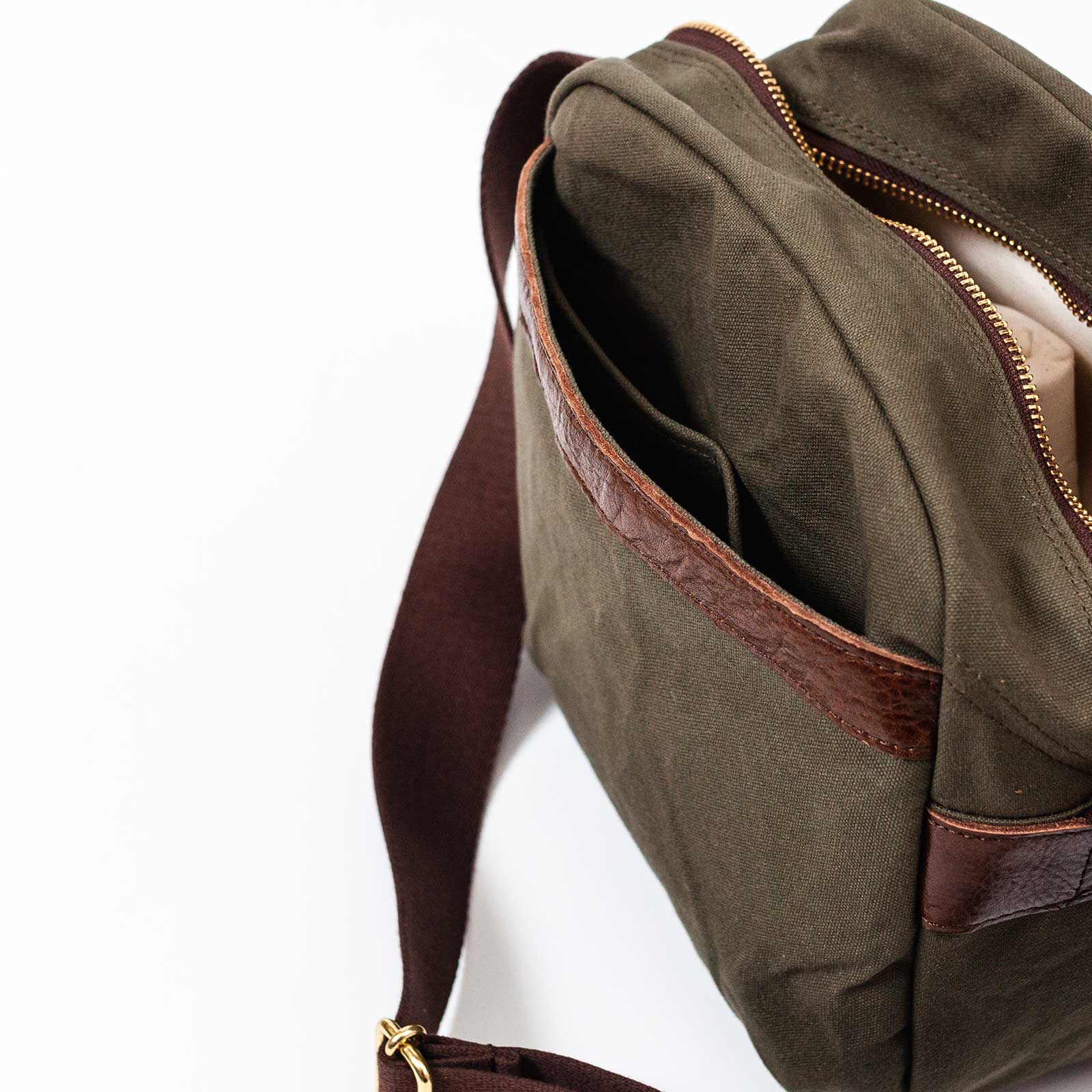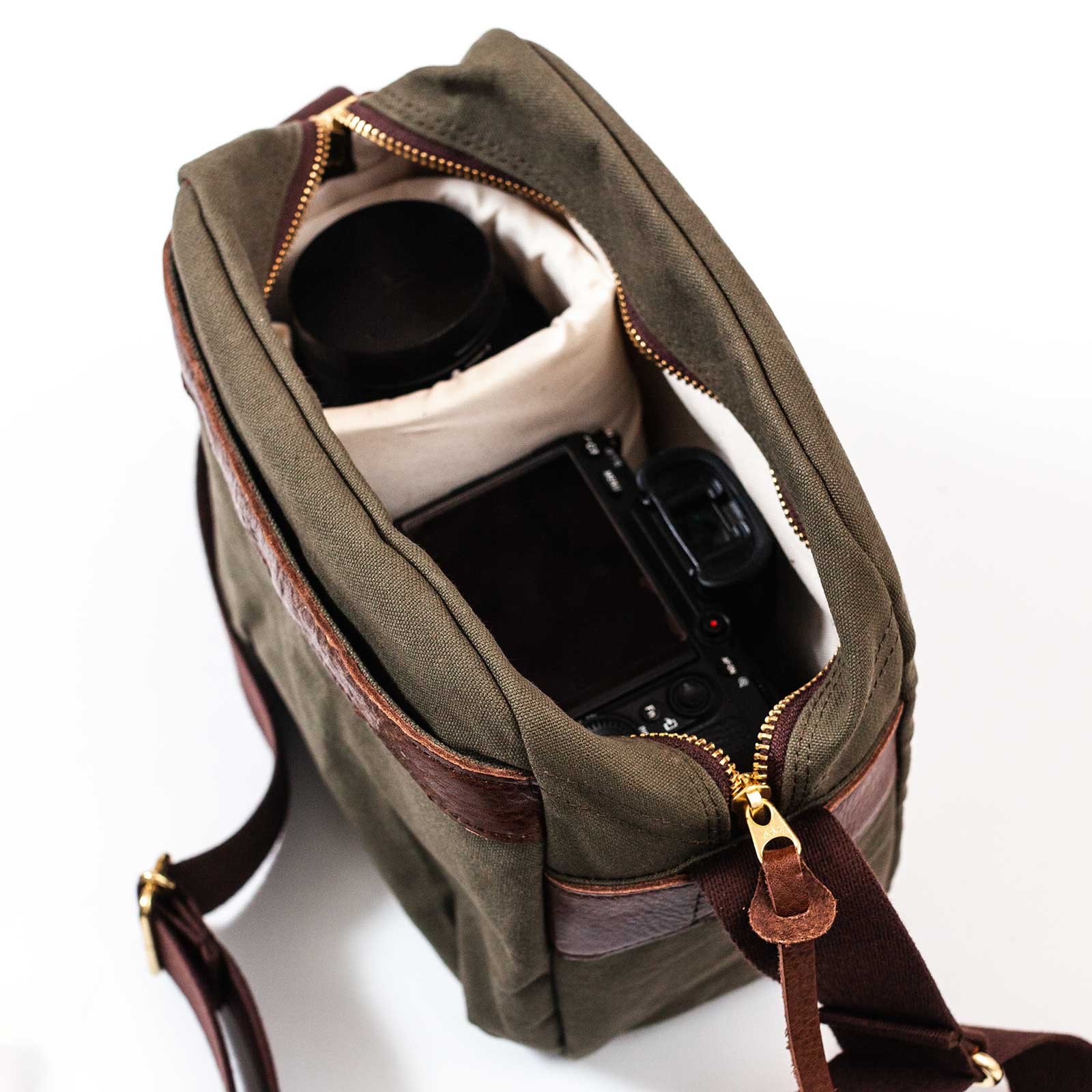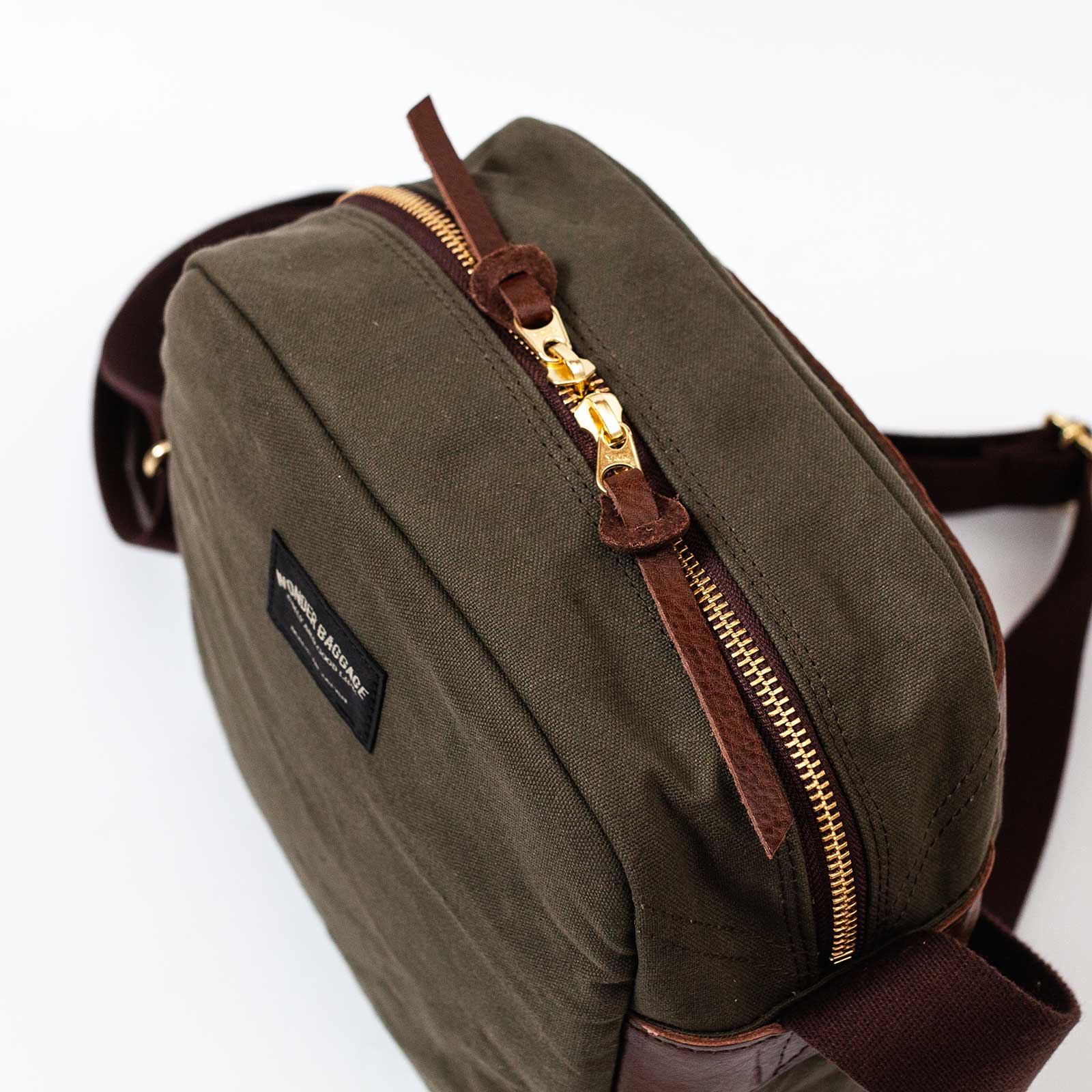 全面を国産の防水パラフィンキャンバス生地で構成。四方を同率曲線で交差し、交差点をラウンドで落としたゆるやかなシルエットのショルダーバッグ。天口のメタルファスナーによる開閉やシンプルな外装、部分使いされた厚口のオイルレザーがカメラバッグにはない佇まいを生み出している。