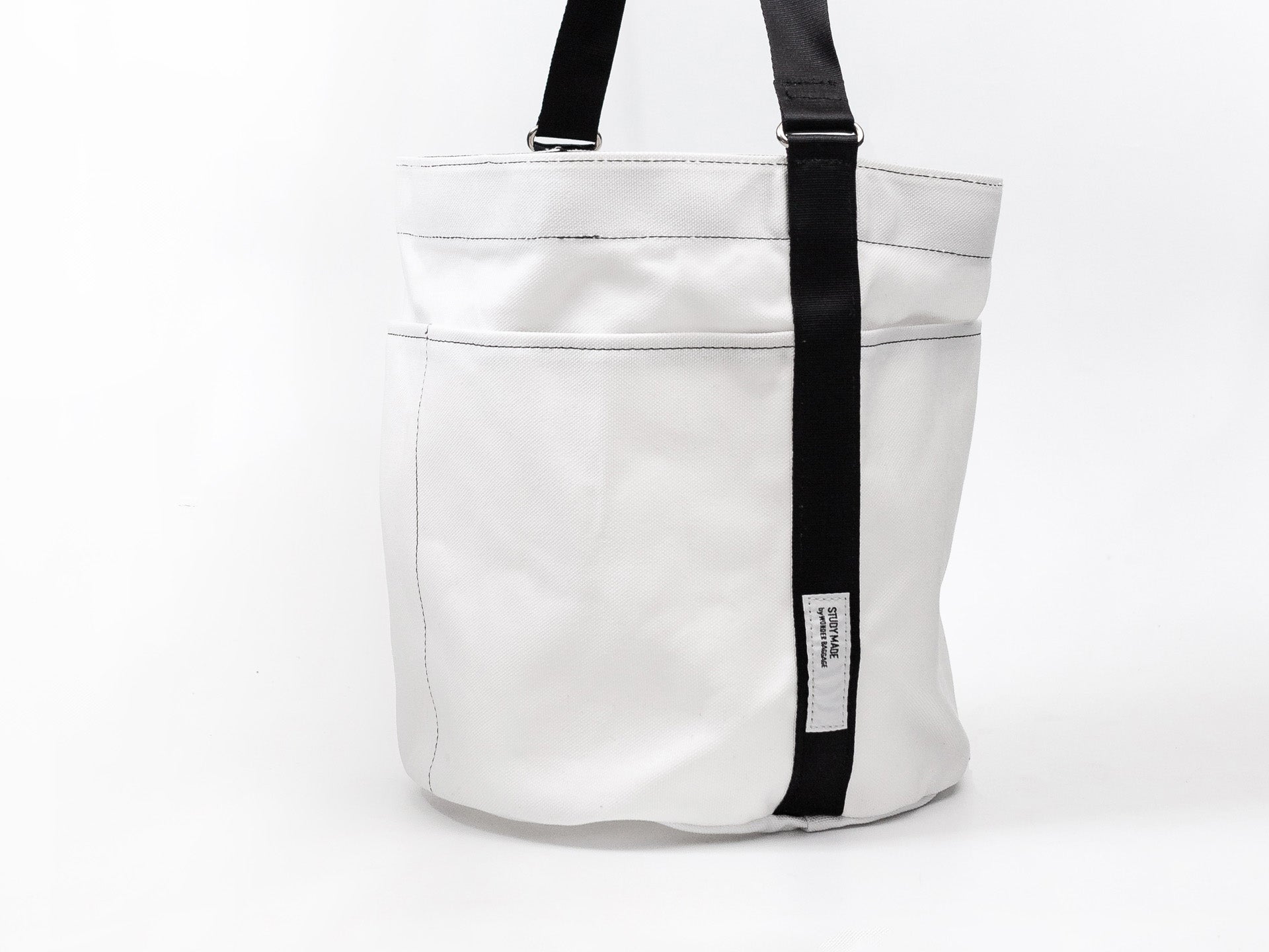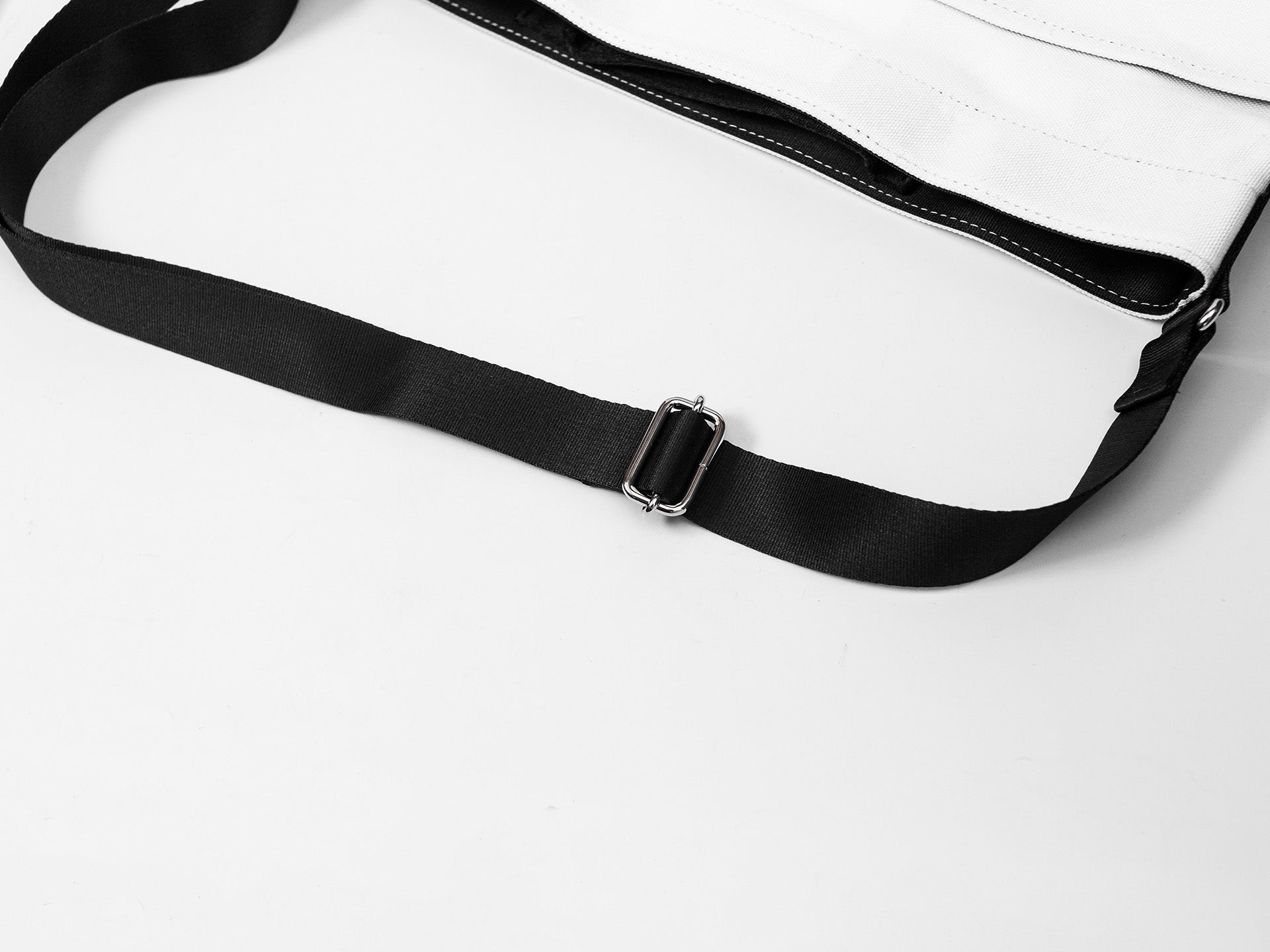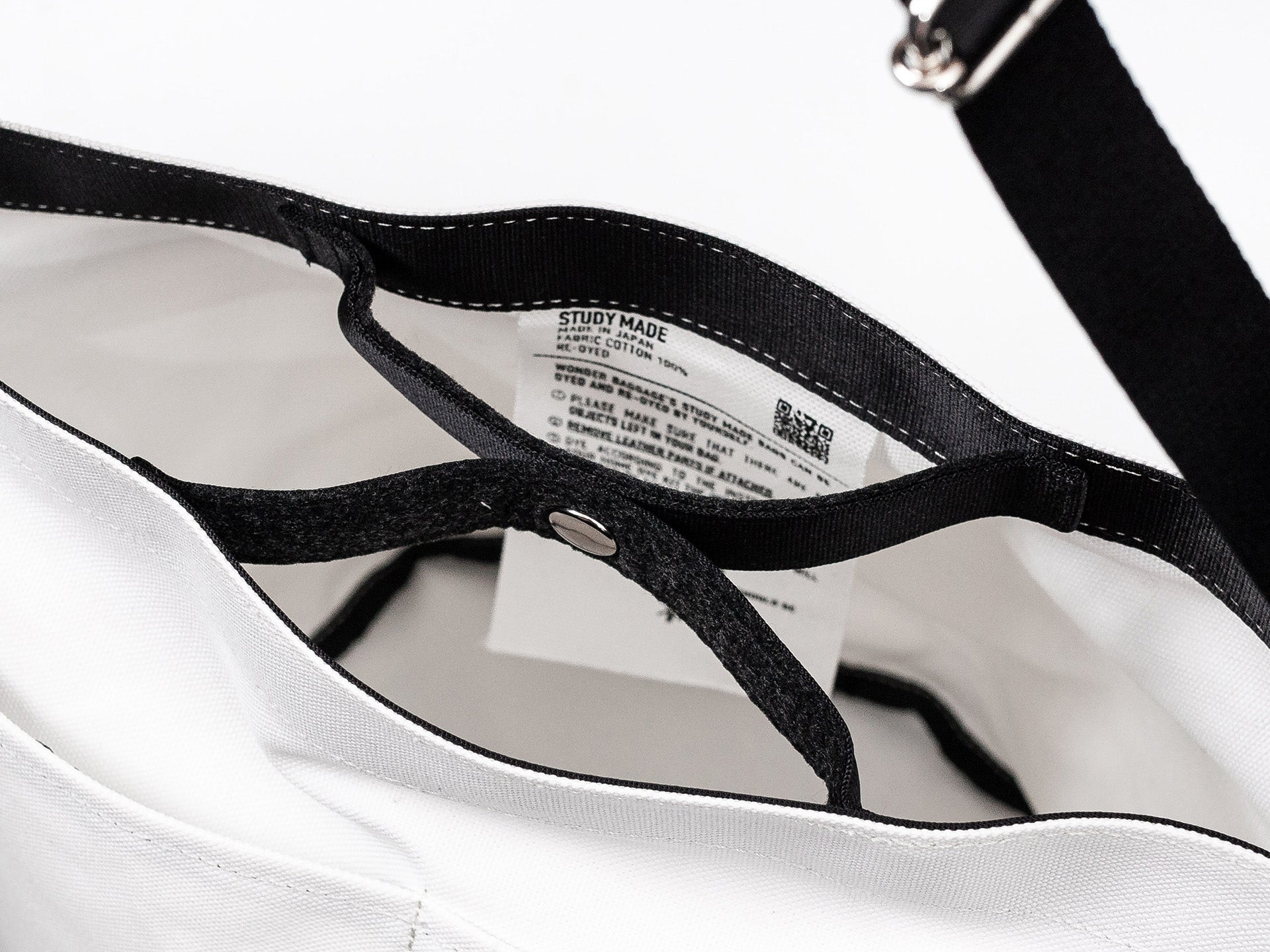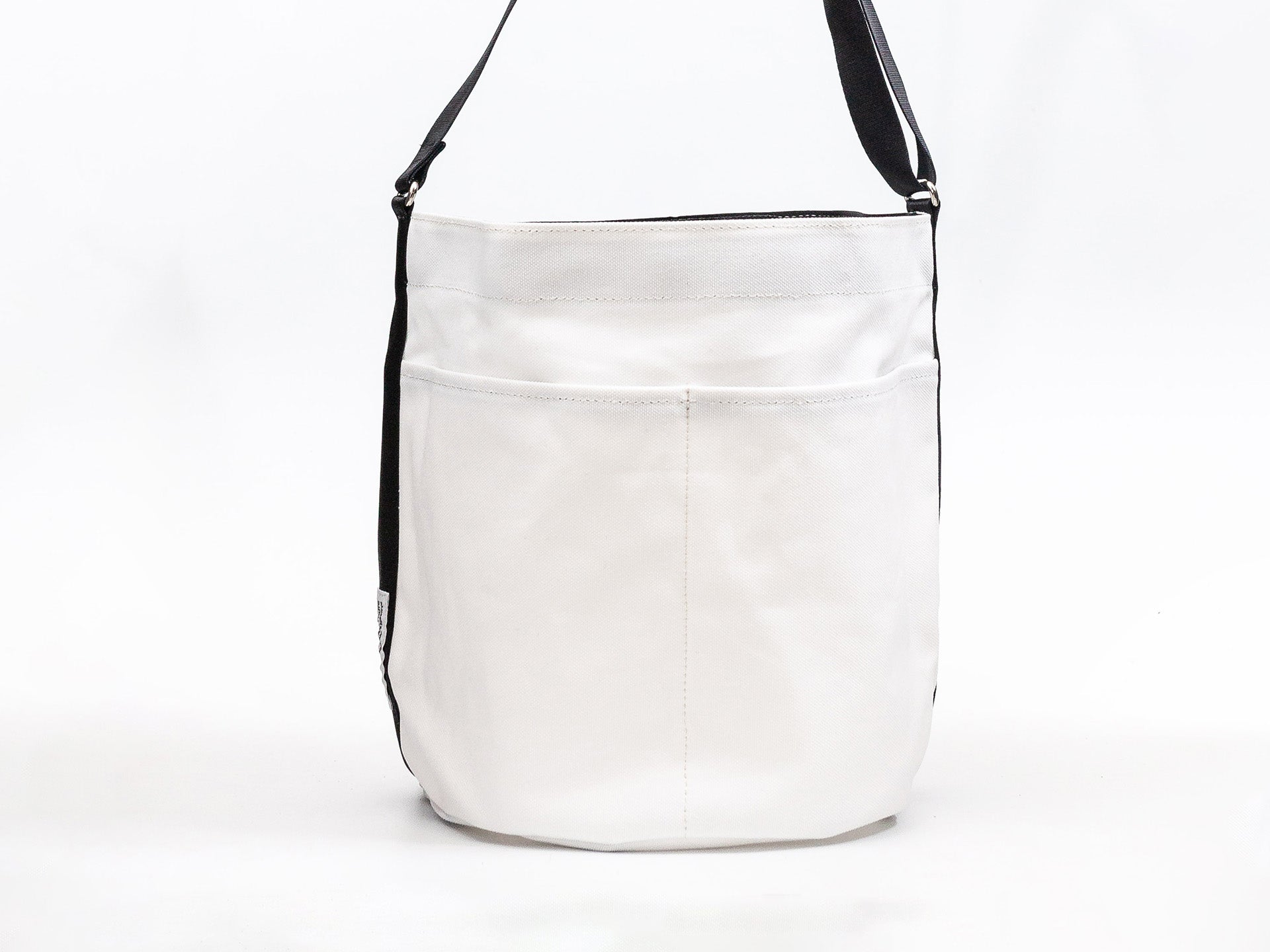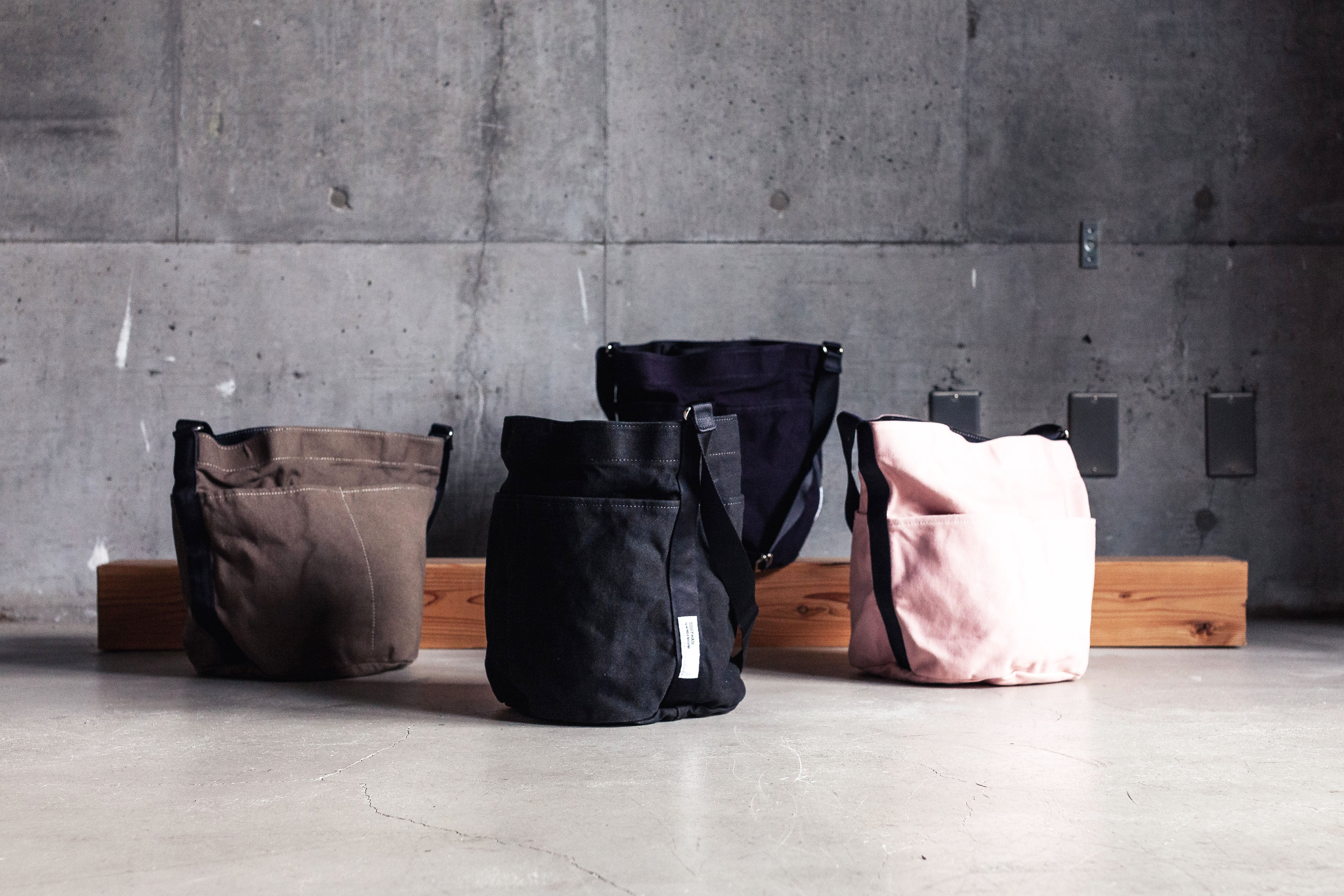 円筒状のショルダーバッグ。外周に4つのポケットを配置し、身の回り品を素早く収納ができる。本体材に8号帆布を使用、テープ材、フェルトのクッションなどディティールにこだわり抜いた設計となっている。